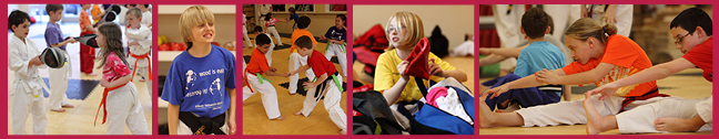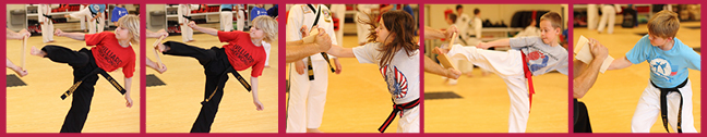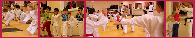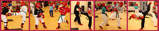 Sparring teaches good sportsmanship, manners, self-control, focus and self-confidence. Only light contact is allowed at first with students progressing to medium (but never full impact contact) as they feel more confident. Students practice techniques on targets to learn the difference between punching and kicking targets hard and making appropriate contact with a sparring partner. Students learn a variety of combinations they can use in sparring, but the goal is for them to see open target areas on their partner/opponent and to combine a variety of techniques to score points.
