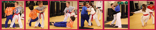 We also periodically teach a few techniques that are what most non-martial artists think of when they hear the term “self-defense.” How do you get away if someone grabs you around the neck or by your arm or your hair? What do you do if someone shoves you against a wall? How do you deal with the bully on the playground or the obnoxious co-worker at the holiday party? Who is a "stranger" and how can you use your voice, knees, elbows and more to be safer? What if the attacker is a whole lot bigger than you? Often an incident can be handled without punching or kicking the offender — as martial artists our goal is to try to resolve things as peacefully as possible and to avoid a violent confrontation. We teach students how to avoid a grab, to use pressure points and counter grabs and even an attacker’s own body weight to end the attack. We periodically teach women’s self-defense clinics and Stranger Danger/Bully Awareness classes for kids at our school and can bring those classes to the public schools and businesses.
